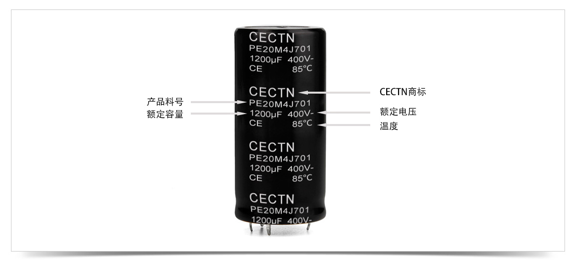 CECTN電解電容印字信息中包含了牛角型電解電容的電壓、容量、溫度、壽命、焊針數(shù)量型號等眾多信息,詳細(xì)了解請點(diǎn)擊進(jìn)入《牛角型電解電容料號說明》頁面。